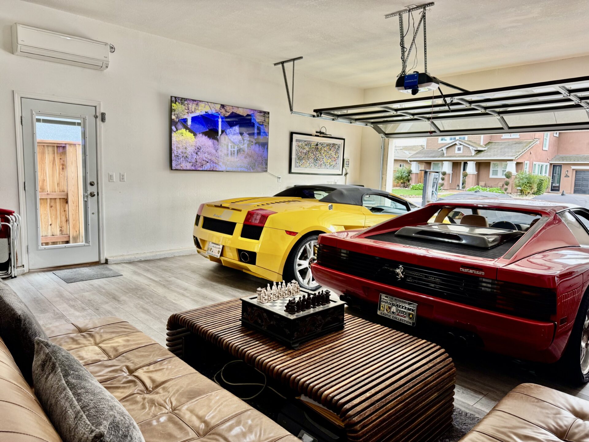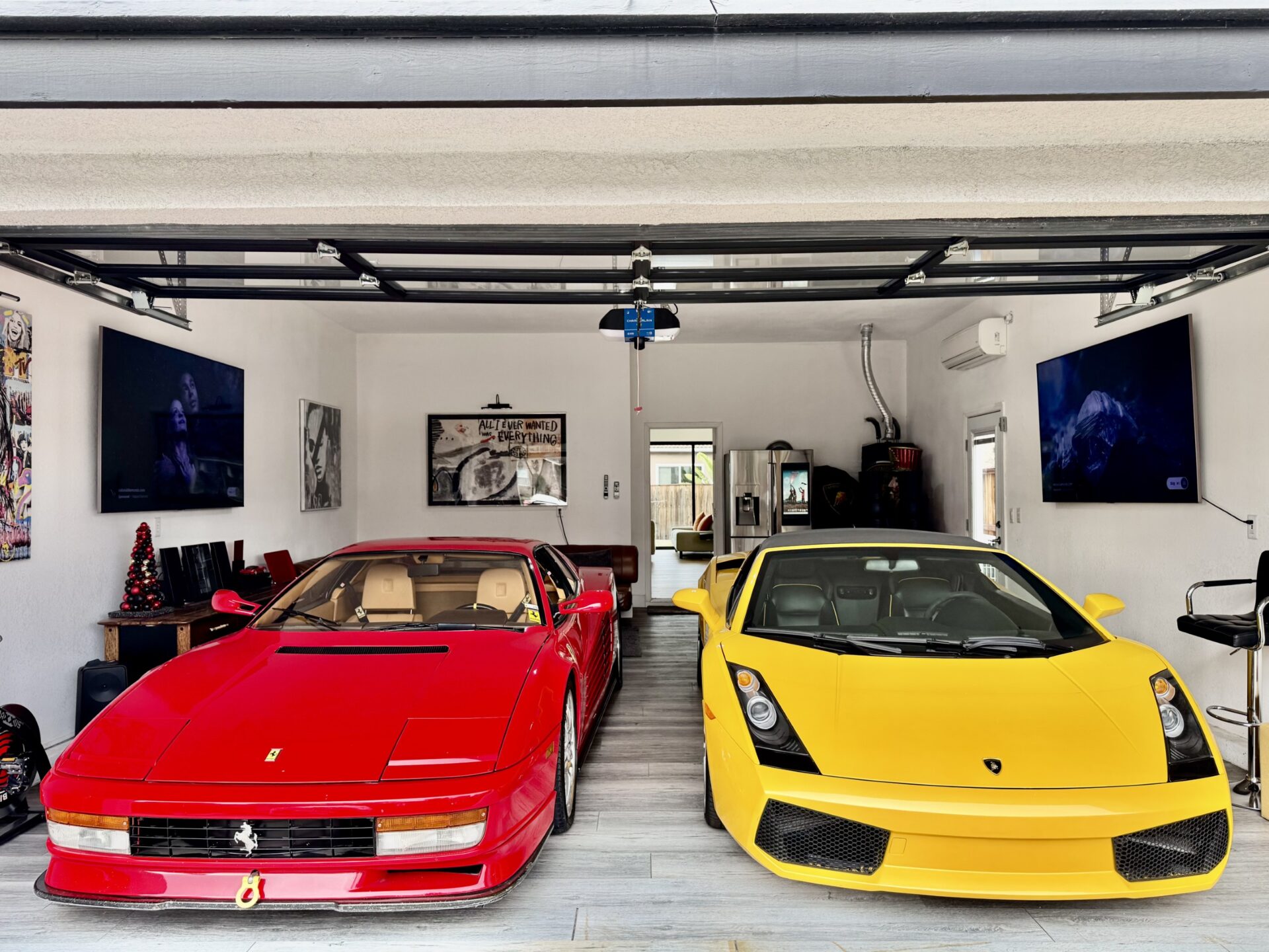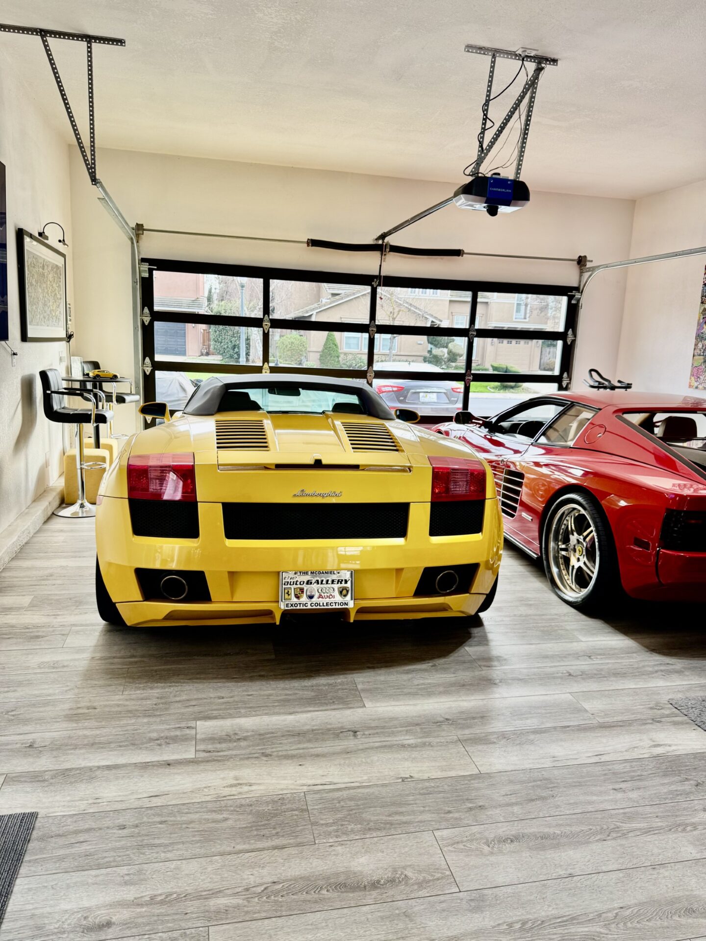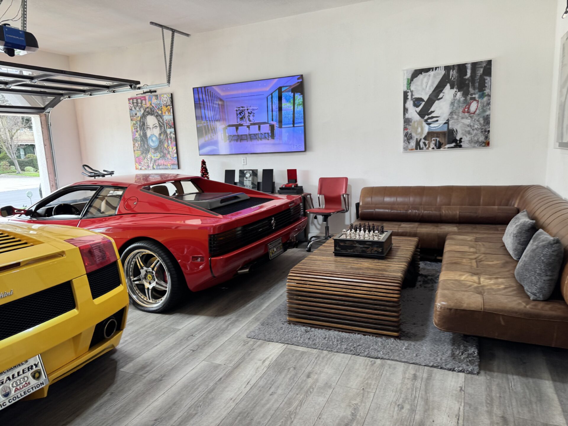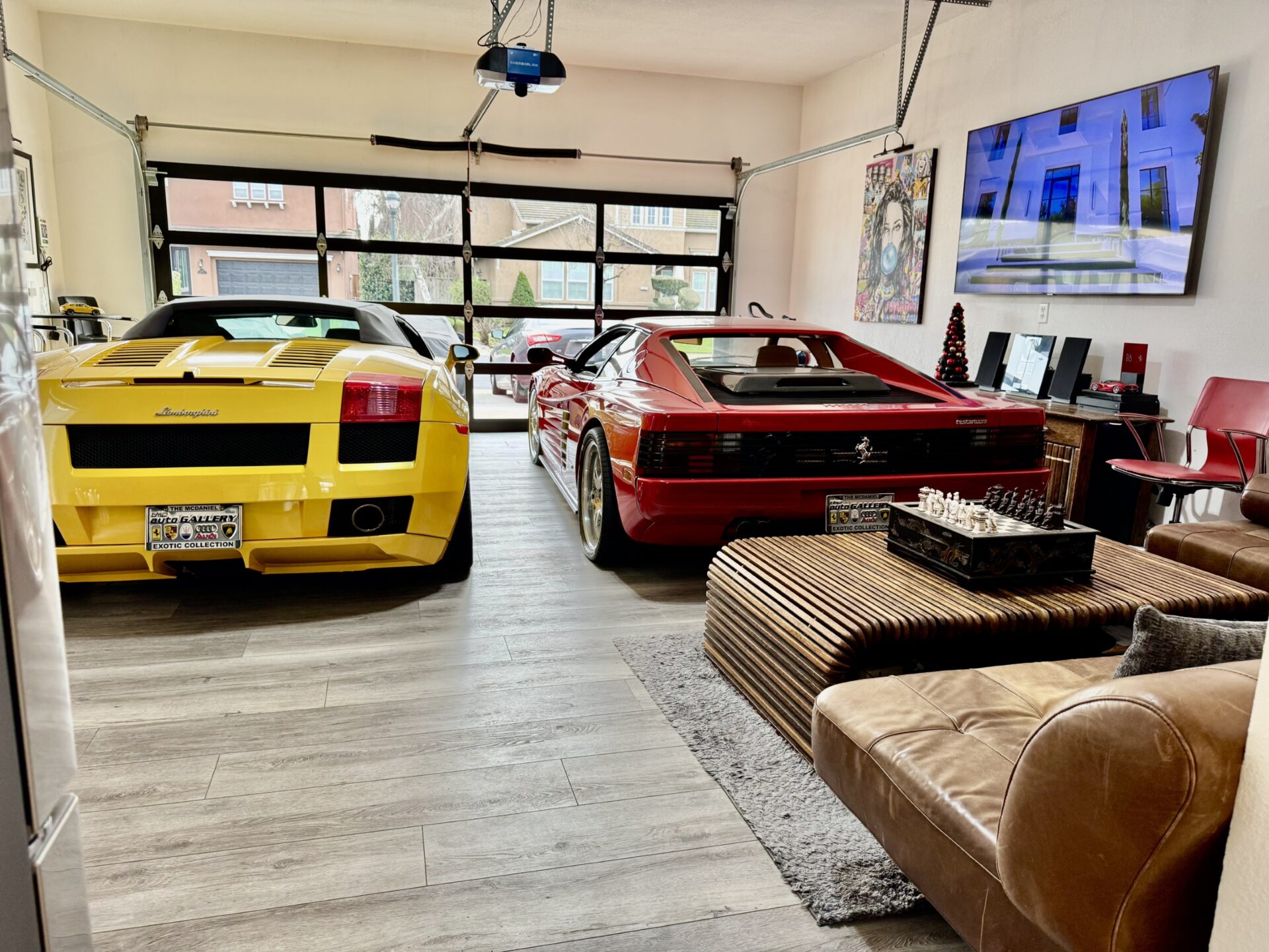 Where once there was a two-car garage, now sits an oversized four-car space with a full, clear-glass door, clean white walls with a matching ceiling, and woodgrain flooring. The oversized nature of the garage allowed Ron to put his Ferrari Testarossa and Lamborghini Gallardo on full display while enjoying enough space to establish two seating areas. With a full glass door, plenty of light is gently bounced around by the white walls during the day, and gallery lighting creates a warm environment at night. From the outside looking in, the garage lends the feel of a high-end showroom. But, despite the visual appeal and continuity with Ron’s house, the idea of a glass garage door wasn’t popular with the HOA.