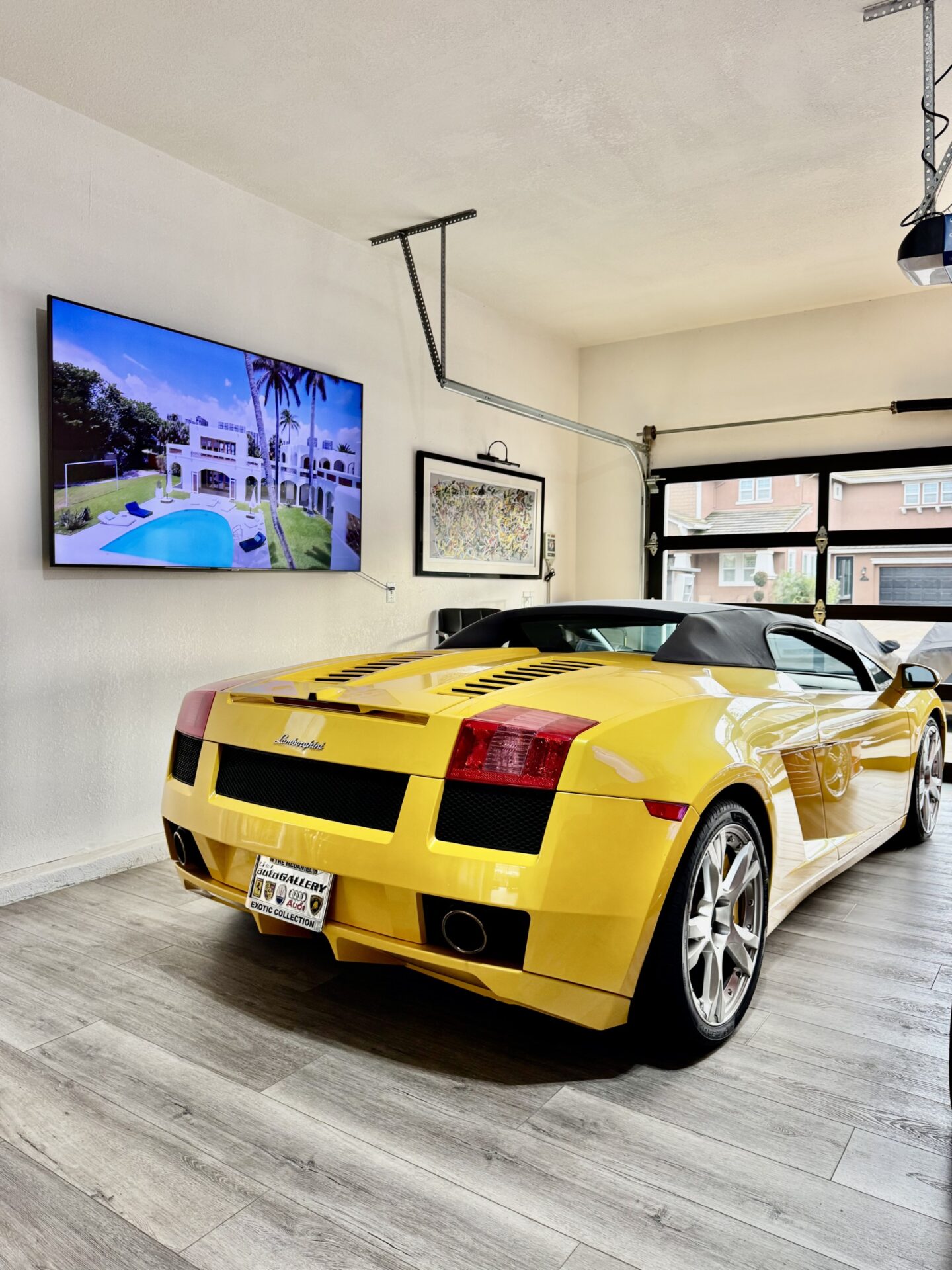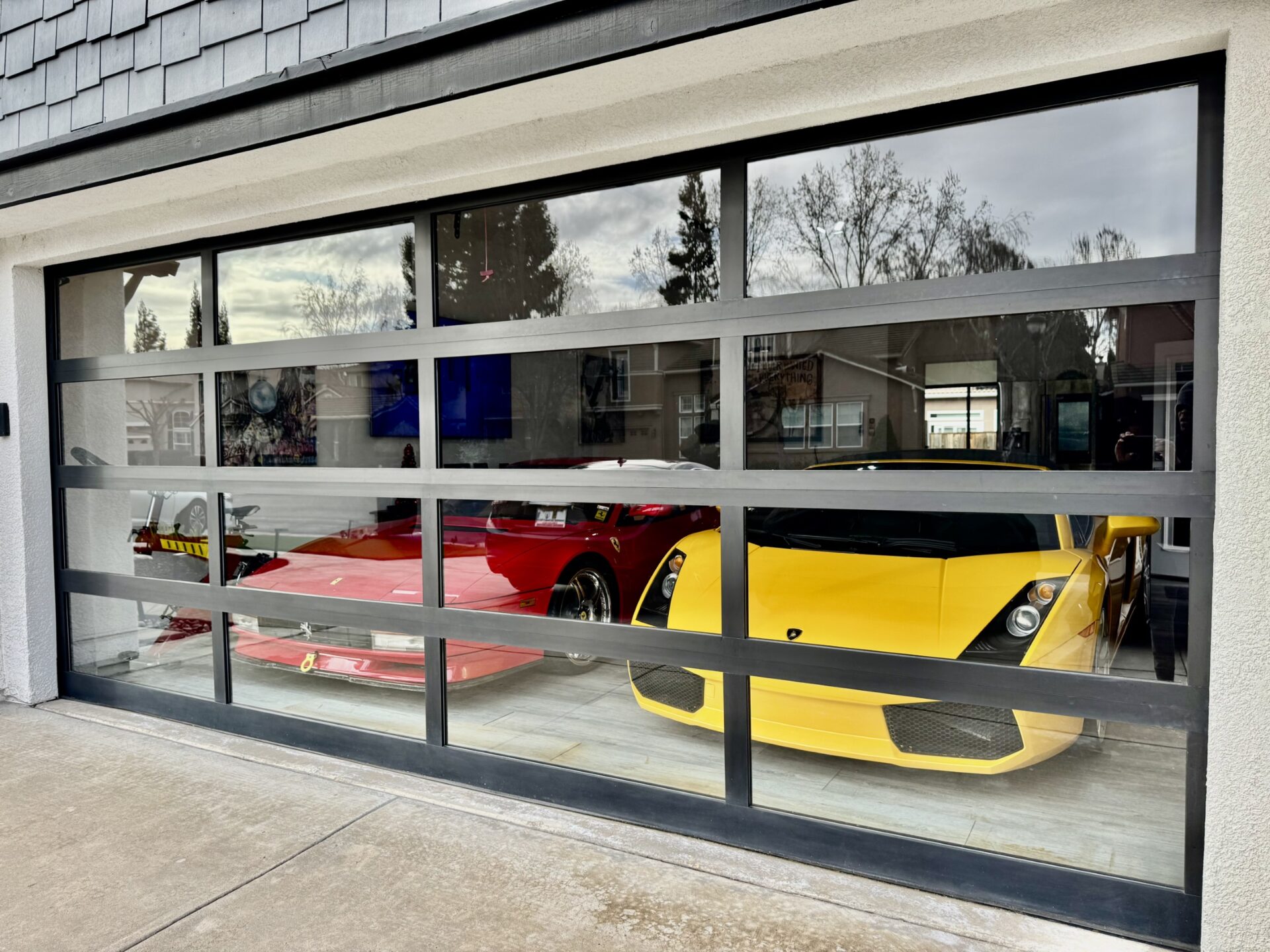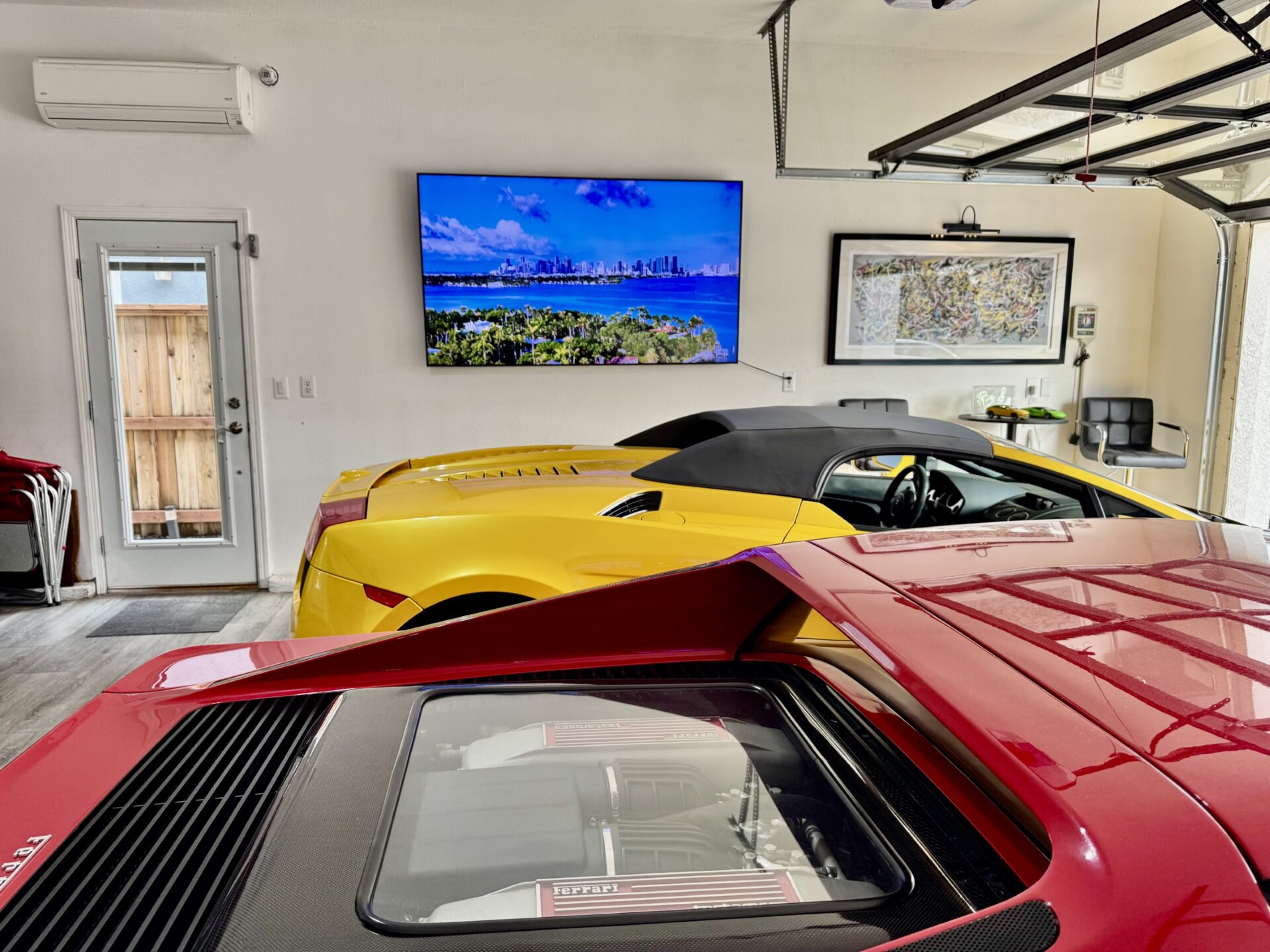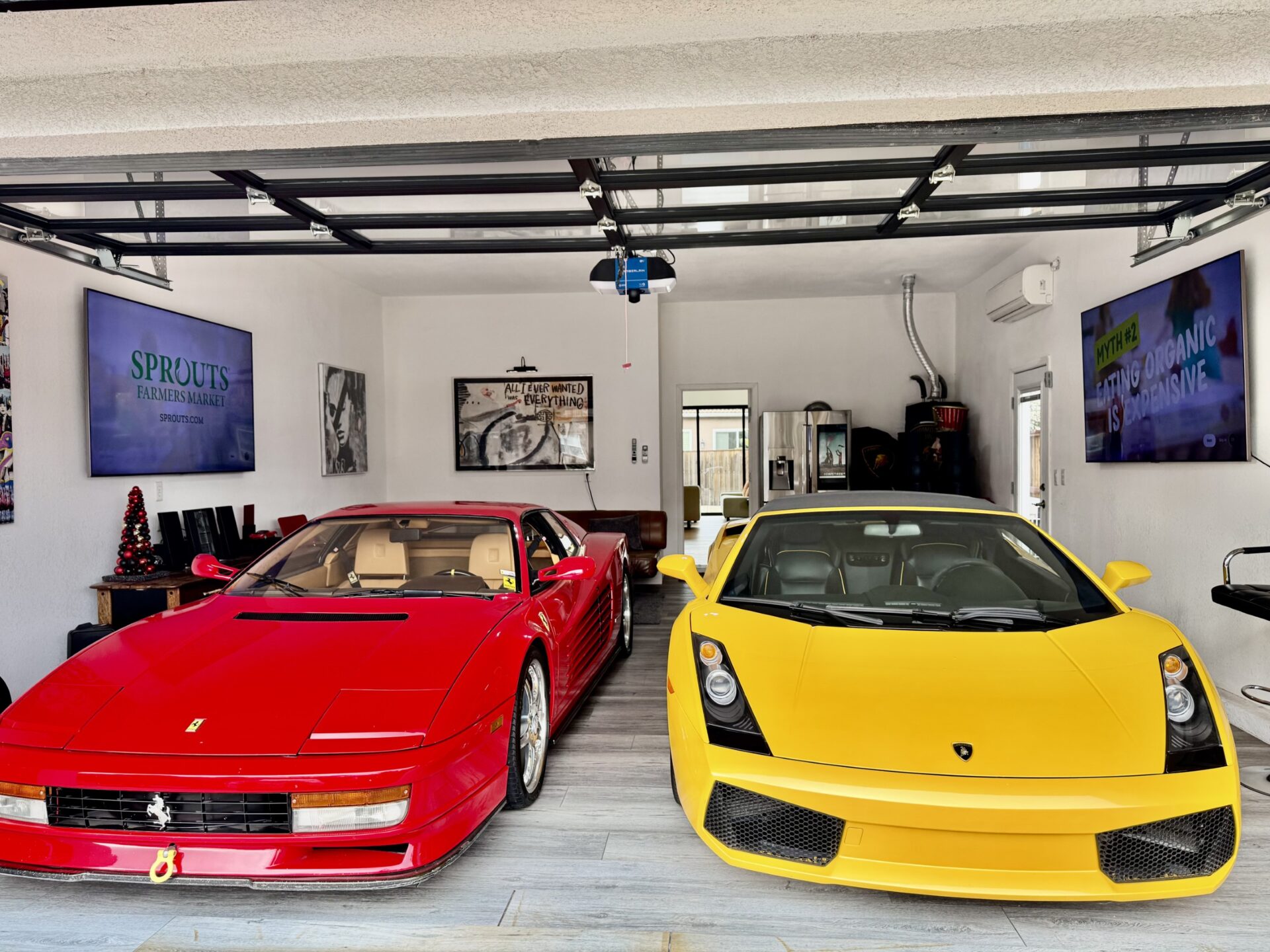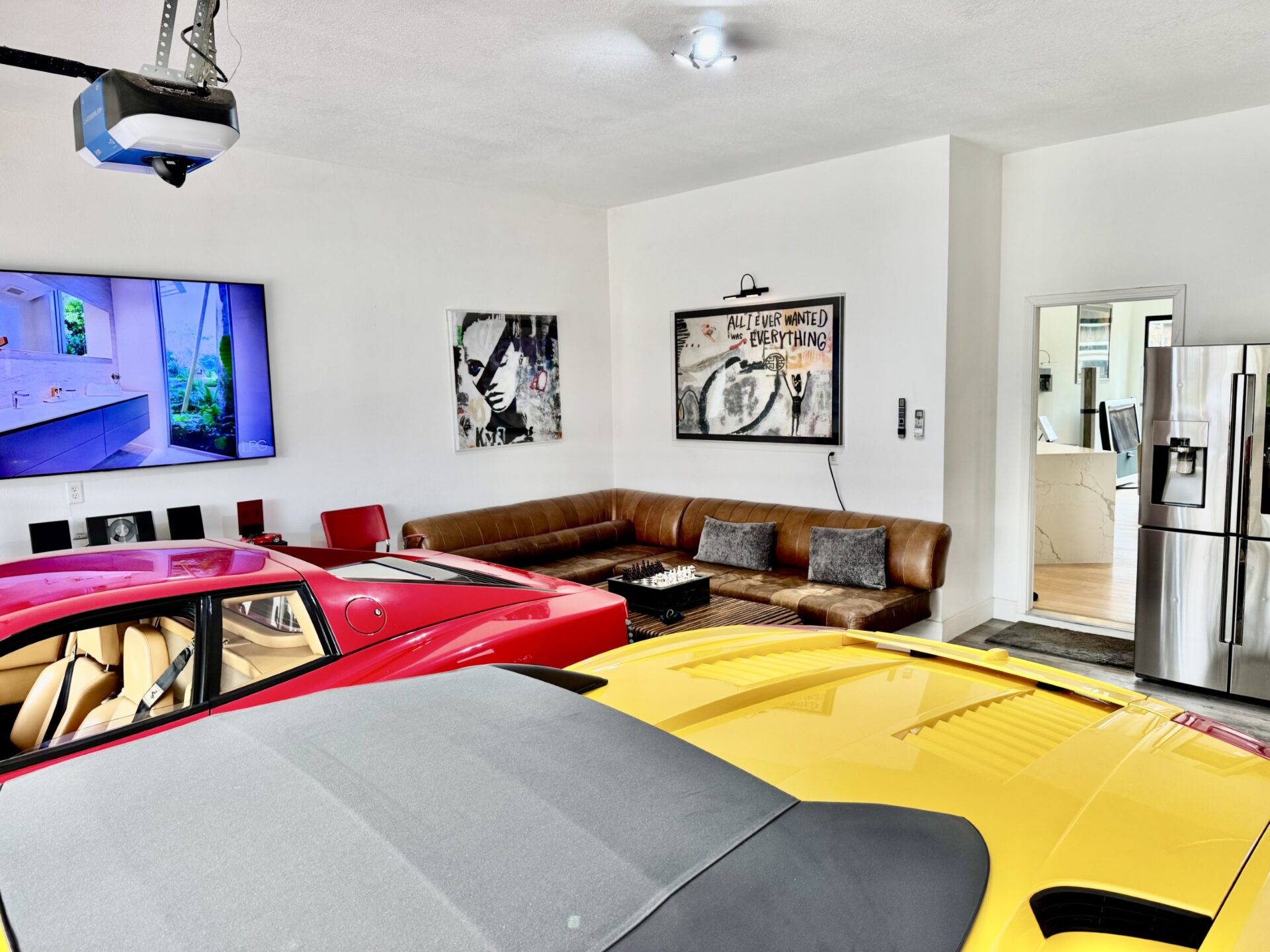 Where once there was a two-car garage, now sits an oversized four-car space with a full, clear-glass door, clean white walls with a matching ceiling, and woodgrain flooring. The oversized nature of the garage allowed Ron to put his Ferrari Testarossa and Lamborghini Gallardo on full display while enjoying enough space to establish two seating areas. With a full glass door, plenty of light is gently bounced around by the white walls during the day, and gallery lighting creates a warm environment at night. From the outside looking in, the garage lends the feel of a high-end showroom. But, despite the visual appeal and continuity with Ron’s house, the idea of a glass garage door wasn’t popular with the HOA.