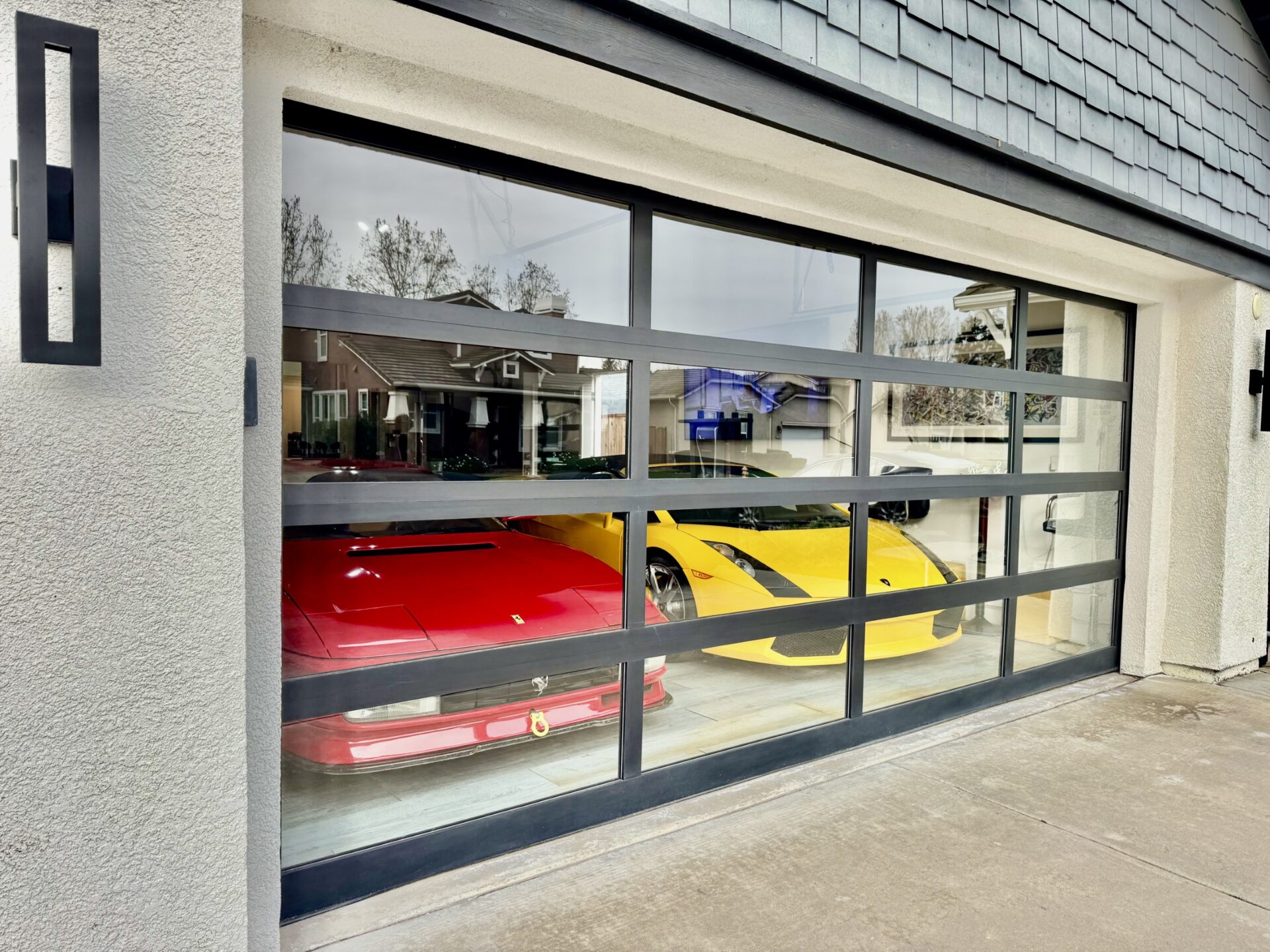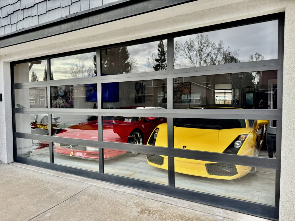 “Initially, the HOA wasn’t open to the clear-glass garage door,” Ron said. “And I understood their reasoning; it made perfect sense. The rule was in place to prevent people from seeing unsightly items like lawncare and sporting equipment. Completely understandable, but my vision was to create a gallery lounge that housed my cars, something comfortable inside and aesthetically pleasing when looking at the house from the street. Also, because so much of the house is glass, to install a wood or otherwise solid door simply risked the flow. A glass garage door was imperative.”